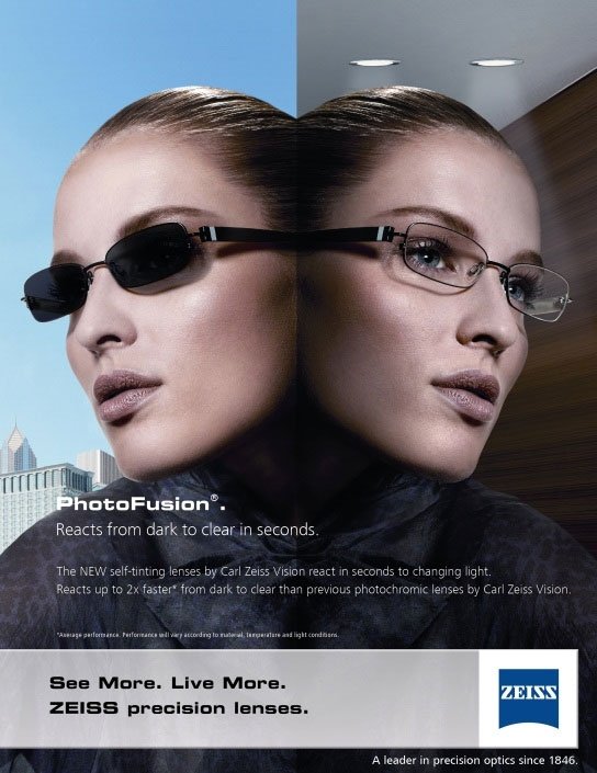 Утончённые фотохромные линзы для очков Carl Zeiss асферического дизайна из материала 1.6 с покрытием Dura Vision Platinum. Интенсивное затемнение и высокая скорость работы.